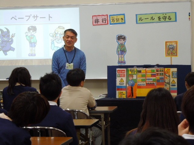 今日は、難波少年サポートセンターからゲストティーチャーをお招きして、非行防止教室がありました。「万引き」の話を中心に、犯罪行為についてペープサートやクイズを交えて教えていただきました。