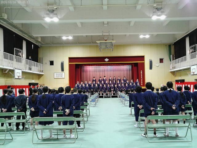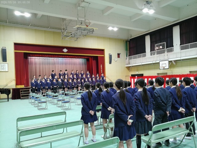 今日は、明後日18日(水)の卒業式に向けて予行練習が行われました。合唱や呼びかけの言葉から、卒業生や在校生の思いがひしひしと伝わってきました。長時間の練習でしたが、背筋をぴんと伸ばして真剣な眼差しで取り組むことができました。