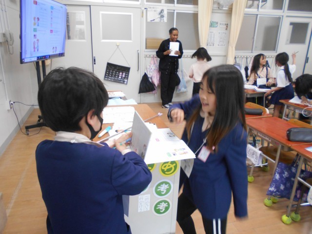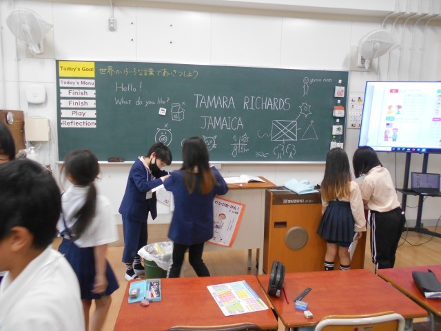 写真は、あいさつをしてから好きなものを英語をしている様子です。