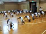 4年生は、障害物走です。マットで転がり、フープをくぐり、ミニハードルを越え、跳び...