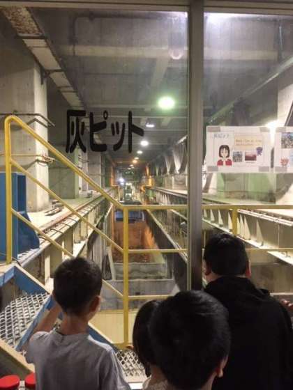 次に、工場内の見学を行いました。見学では運ばれてきたゴミをクレーン操作でゴミの投入ホッパに入れる作業を見たり、中央制御室やプラットフォーム、灰ピットの様子を見たりしました。