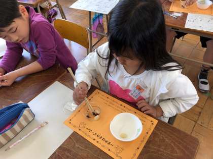 栄養指導の授業で、おはしの使い方を学習しました。正しいおはしの持ち方を教えてもらい、「むずかしい!」といっていました。まめつまみゲームをし、楽しく学習できました。おはし名人をめざして練習しますので、おうちの方でも見てあげてください。よろしくお願いします。