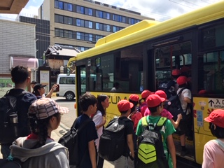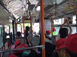 貝塚駅で水間鉄道に乗り換え、現在バスに乗車中です。宿舎が近づき、少し興奮気味の子どもたちです。