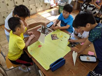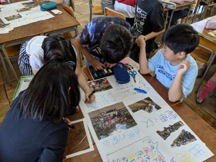 教室では一泊移住のふり返りとして、班ごとに協力して新聞を作りました。