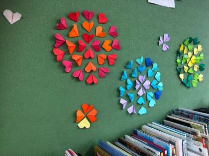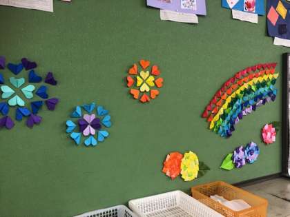みんなでハートをたくさん作りました。そのハートを使って「虹」と「花火」にしました。