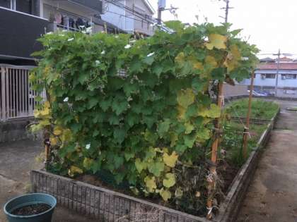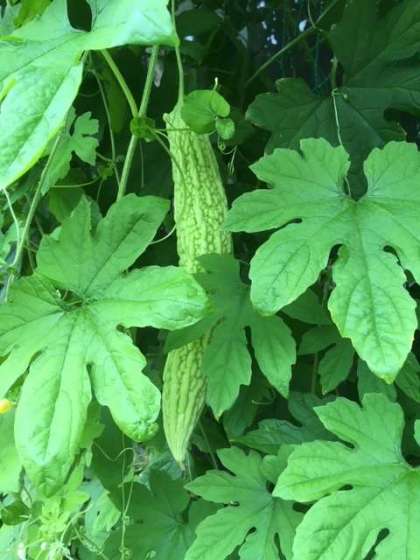 緑色に覆われた中から、小さなヒョウタンがひょっこり顔を出してきたり、ゴーヤも10本以上収穫できたり、ヘチマは50cmを超えそうな大きさまで成長したりしているものも表れてきています。