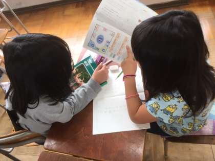 国語の学習で「案内係をしよう」と、とある水族館の地図やイベントマップを頼りに、案内係役、お客さん役になりきって活動をしました。
