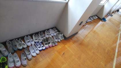 暑さ対策のために児童朝会を4階多目的室で実施しました。