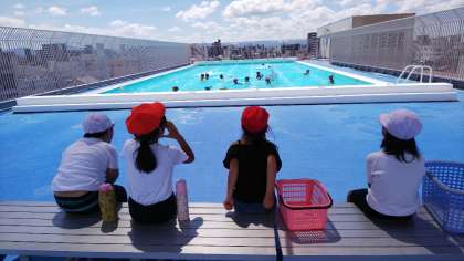 2年生のプール納めは、見学者もお手伝いや応援で参加し、