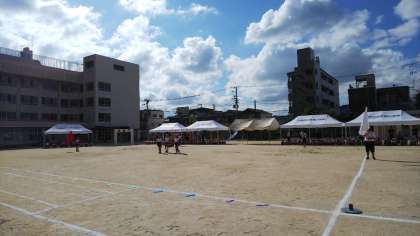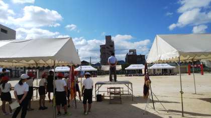 熱中症対策の1つとして児童テント内で開会式を行います。