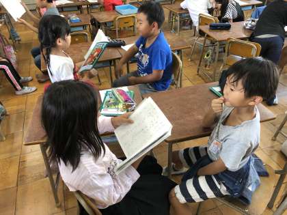 国語(日本語)科では、教科書に載っている絵を見て、自分たちでお話を作りました。同じ絵を見ても、それぞれでちがうお話ができあがりました。それぞれで動物に名前をつけました。かくれんぼするお話や、誕生日パーティーをするお話を作り、友だちの話を聞きながらとても楽しそうな子ども達でした。友だちの工夫していた点を探すのも、上手になってきています。