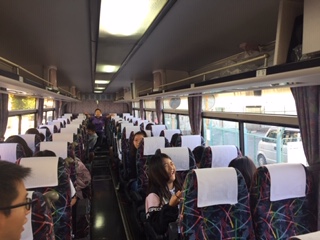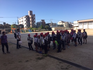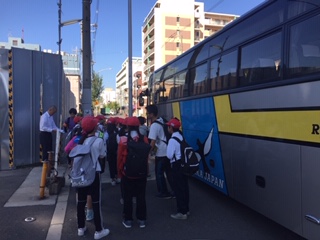 お天気に恵まれ、絶好の稲刈り日和です。元気に出発した5年生の子どもたちです。