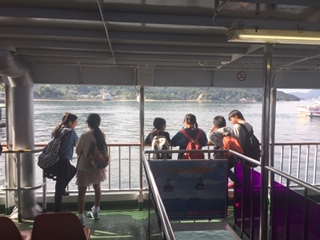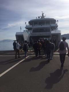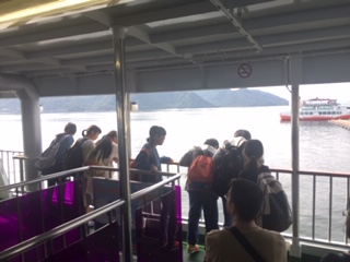 宮島へ向けて、船に乗ります。わずかな時間の乗船ですが、子どもたちは船の中で楽しそうに過ごしていました。