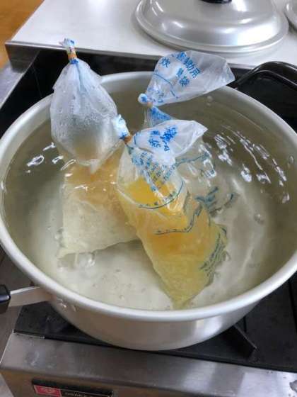 今日のちびっこ防災の活動では、「ハイゼックス」で炊飯を行いました。「ハイゼックス」とは高密度ポリエチレンのことで、この素材を利用したものが災害時の「炊飯袋」として使用されています。このハイゼックスの袋の中に米と水を入れて、口を閉じて煮るだけ。30分ほどでお米が炊けます。