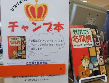 情報委員会の活動で行った『ビブリオバトル』のチャンプの本が夢ひろばのカウンターで紹介されています。