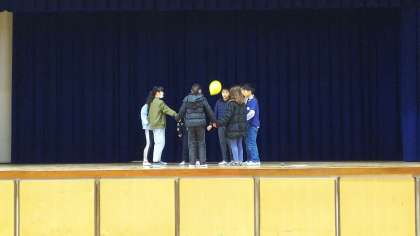 児童集会のゲームのルールを集会委員会さんたちが実演して説明しました。