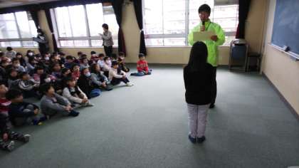 今日の児童朝会は、運動場の状態不良と講堂の作品展示中のため4階多目的室で行いました。