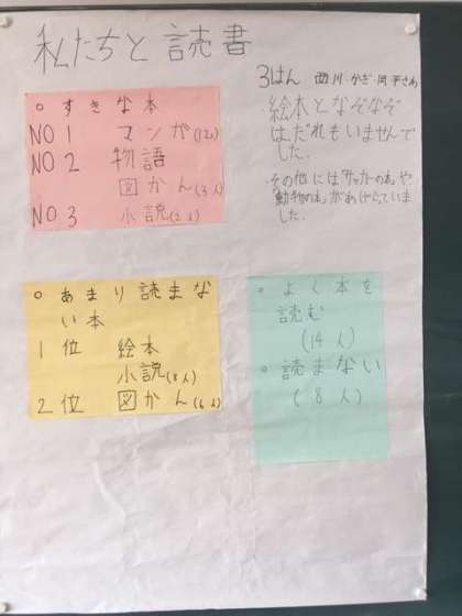 好きな本で、班の予想とは違った「絵本」「なぞなぞ」が意見として出なかったことを、報告するなど、調べたからこそ分かった報告を行うことができました。