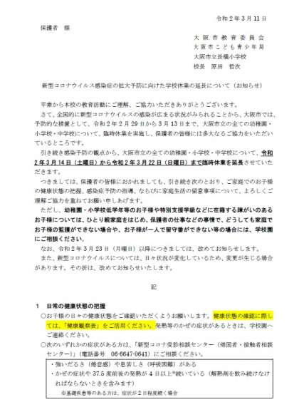 大阪市教育委員会より臨時休業の延長の連絡が来ました。