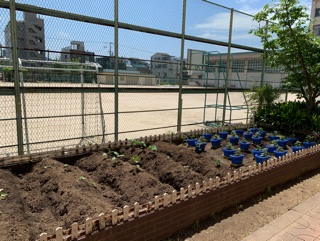 臨時登校日2日目は、ミニトマトの苗植えをしました。子どもたちは、「緑色のトマトがついてる!」「ちっちゃーい!」とそれぞれによく観察していました。午後からは、とてもいいお天気になり、ミニトマトの苗も太陽の光を浴びて、とても気持ちよさそうでした。