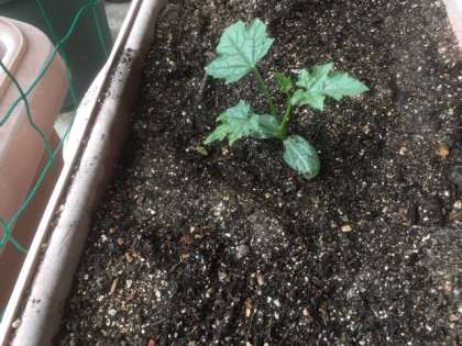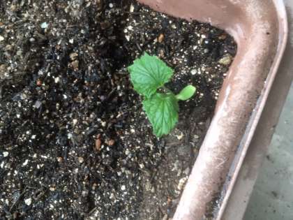 ヘチマの苗(なえ)の横(よこ)に種(たね)から発芽(はつが)した植物(しょくぶつ)が芽(め)を出しました(3まい目)。