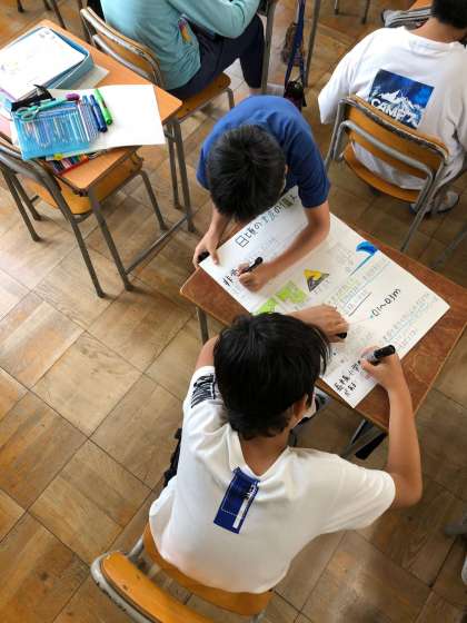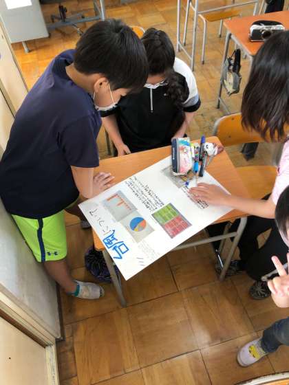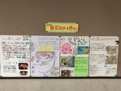 6年生は、国語科の授業で「防災ポスター」を作りました。グループで協力して、パンフレットで調べたり、タブレットをつかって検索をかけたりします。その作業が終わったら、自分たちが調べた内容を持ち寄って、ポスターに仕上げます。作業や相談の様子を見ていると、6年生らしい立派な姿がありました。