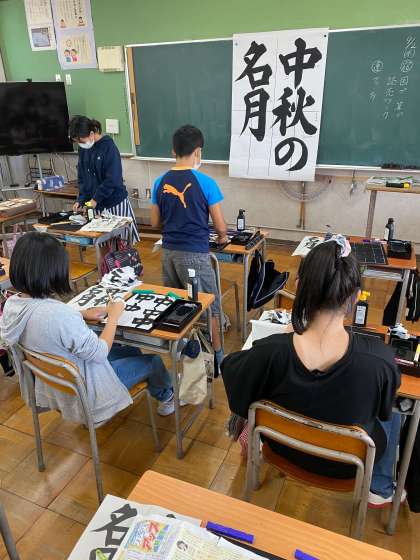 先日、毛筆の学習を行いました。9月らしいお題「中秋の名月(ちゅうしゅうのめいげつ)」を半紙に書きました。いつもは4文字ですが、今回は5文字で少し難しい様子でしたが、子どもたちは集中して取り組んでいました。繊細さや思いっきりの良さが表れ、子どもたちらしい作品に仕上がりました。
