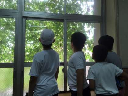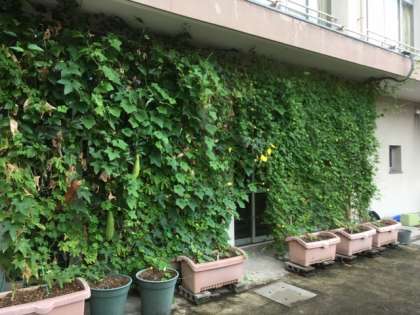 5月に植えた緑のカーテンが四ヶ月目を迎えました。8月の暑い日々もなんとか乗り越え、朝晩の涼しさもあり、緑がまた一層濃くなってきました。二階までつるも伸びています!