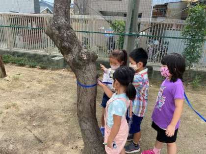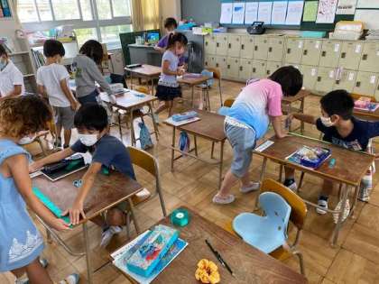 算数科で「どちらがながい」の学習をしています。えんぴつや教科書の縦と横などの身近なものの長さくらべをして、その後、教室・廊下や運動場にあるいろいろなものの長さをテープを使って測りました。ペアや班の友達と仲良く協力して活動する姿に大きな成長を感じました。