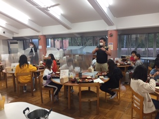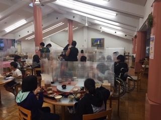 夕食になりました。感染症予防の対策がされ、子どもたちも安心して食事をすることができています。もちろん手洗いや消毒、食事のマナーもきちんと守る子どもたちでした。