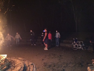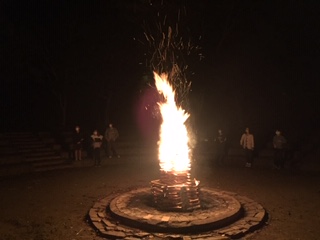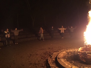 本日の活動の最後は、キャンプファイヤーです。日暮れが早くなり、ファイヤー場も薄暗くなっていました。静かな森に大きな炎が燃え上がり、大きな拍手とともにスタートしました。ソーシャルディスタンスを心掛け、出し物の内容や進行も工夫されたものでした。