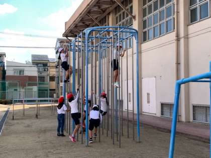 鉄棒では、大きくなってきた身体を上手に使って、回転、静止を組み合わせながら技を身に着けます。(写真は準備運動の様子を掲載しています)ハードル走ではタイミングよく跳ぶ、走るをくり返します。リズムよく走る方法を考えています。ボール運動では、ドリブル、パス、チームワークを身に着けます。