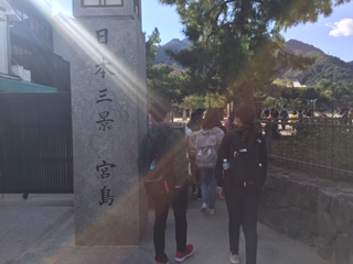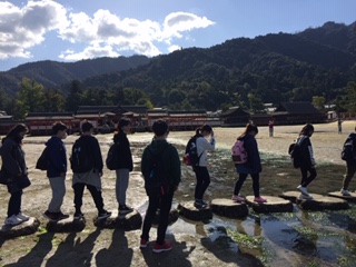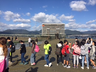 宮島に到着しました。厳島神社を眺めながら、干潮で潮が引いた海を歩いています。