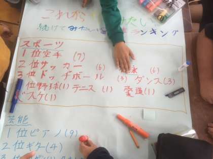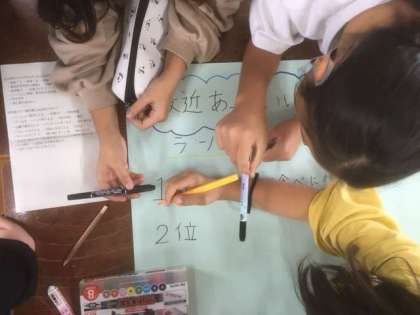 クラスでアンケートを取り、今の4年1組の考えていることをそれぞれの班でまとめています。レイアウトに気をつけて、丁寧な字を心がけて書いています。