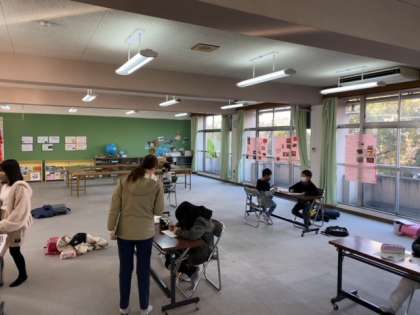 3学期はじめのちびっこ防災プロジェクトの活動がありました。今回の活動では、密を避けるために活動場所をいくつかにわけて、それぞれ取り組みました(^^)/
