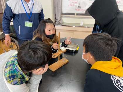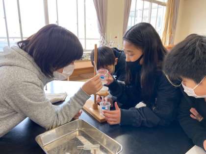 理科でもののとけ方の学習をしています。食塩やミョウバンの水溶液から、とかしたものを取り出すにはどうすればいいのかを考え、冷やす実験をしたり蒸発の実験をしたりしました。自分なりに予想を立てて、その理由を自分なりに伝えることができています。