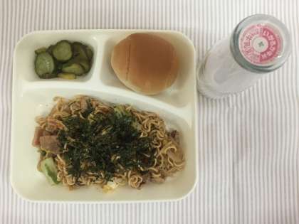 今日の給食は、黒糖パン(小)、焼きそば、きゅうりの中華あえ、牛乳です。