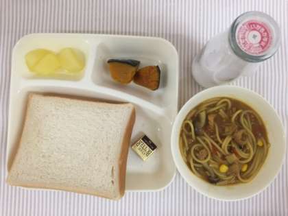今日の給食は、食パン、バター、カレースープスパゲッティ、かぼちゃのバター焼き、りんごの缶づめ、牛乳です。