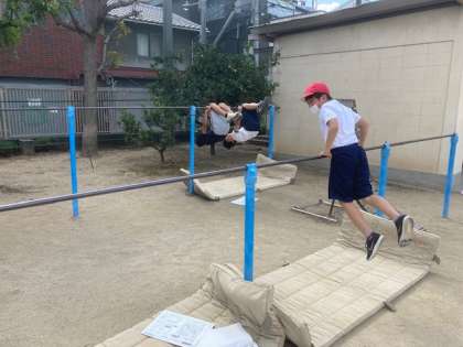 鉄棒では、逆上がりや前方支持回転や後方支持回転にチャレンジしました。
