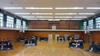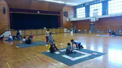 全校で取り組んだ折り染めを合わせて、一つの大きな作品を作り上げます。担当は5年生!画用紙をたくさんならべて…。「右かな?」「上かな?」字のバランスも考えました。