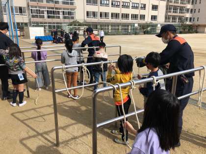 運動場では『煙体験』『ロープ結索』『救出訓練』をしました。
