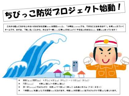 想定される自然災害を視野に入れ、「小学生にだってできることはあるはず!」ということをスタートに子どもたちと一緒に考えていくプロジェクトです。チームの構成は、4〜6年生を対象に希望制です。来週の水曜日まで参加したい人の募集をよびかけています。