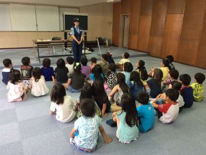 6/10(水)、西成警察の方とジャガぱと隊の方を招いての、防犯交通安全教室を行いました。「知らない人に声をかけられたらどうする?」「横断歩道の渡り方」「赤・黄・青のときの信号機のルール」など、寸劇や紙芝居を交えながら学び、興味深々な様子でした。