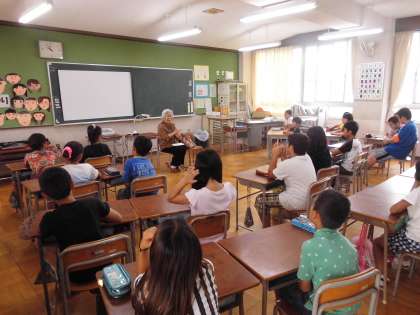 7月3日(金)、ゲストティーチャーの方に来ていただき、“大阪大空襲”についてのお話を聞きました。戦争の頃の厳しい生活や、疎開で家族と離れて寂しい思いをしたことなど、たくさんのお話をしていただきました。