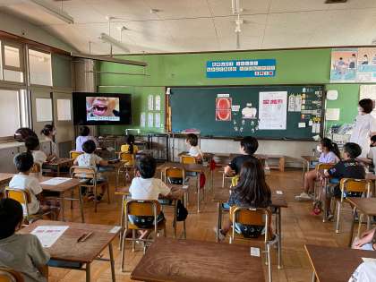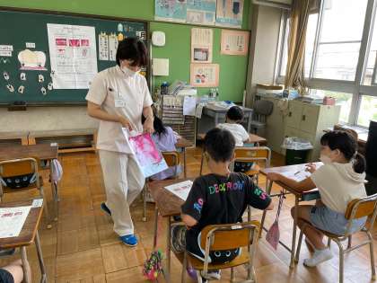 みんなで、お口の観察動画をみました。「はみがき名人カード」に色をぬり、しこうがつきやすいところを確認しました。「だい一大きゅうし」のみがき方や歯みがきのコツを教えてもらいました。