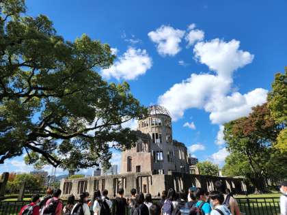 袋町小学校の平和資料館見学を終え、爆心地の場所を確認し、原爆ドームに到着しました。