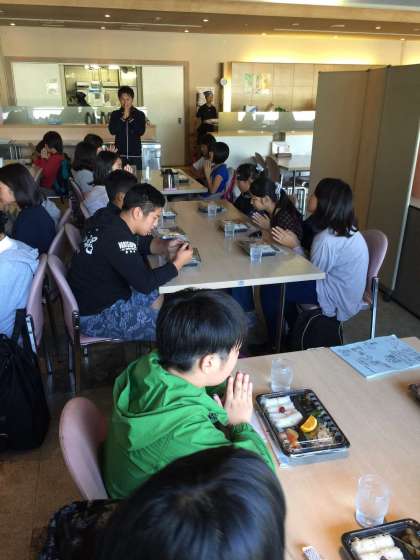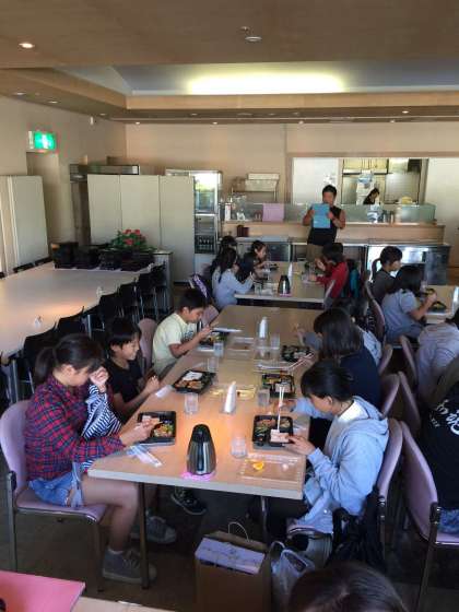 修学旅行3 グリーンアリーナでお昼ご飯を食べています(^o^)