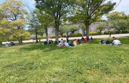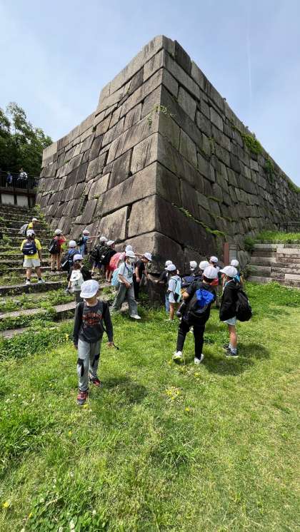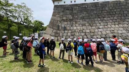 春の遠足で「大阪城公園」に行ってきました!天気も良く、たくさんの人でにぎわっていました!4年生は、平和学習として大阪城の石垣の様子を観察しました。大きな石垣を見たり、触ったりして当時の様子をイメージを膨らませることができました。