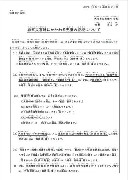 学校の非常災害時に伴う児童の登校についてのお手紙を載せています。