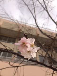 さて、元気な声と一緒に、春?の便りが届いたのか、学校の桜もつぼみが開いていたものがあったので、1枚撮ってみました。
